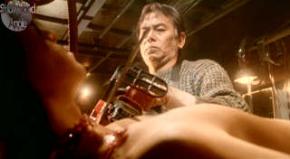Something very odd is happening in the mortuary at this time: Miyako's elderly assistant Kurume (Seijun Suzuki) has been attacked by a mysterious man in a gasmask - who proceeds to steal Yoshiki's head, leaving the perfectly preserved body behind. Suspicion must surely fall on the father, who didn't want the embalming process carried out - and by extension, Jion? However, Hiraoka has a completely different lead in this case. He tells Miyako and Kurume of a band of bodysnatchers known as "Death Traders", who steal corpses from hospitals and funeral homes and harvest the organs for sale on the black market. (That good old-fashioned urban legend of the organ thieves comes into play - echoes of the urban legend mythmaking of Ring here, perhaps?)