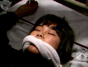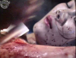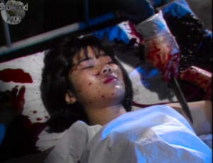 When the woman awakes, she lies on a bed in a small, dark room. Add to that: she's tied by her hands and feet. A quick glance through the room makes it painfully clear that this is not your ordinary small, dark room. This is the type with blood sprayed all over the walls and a mysterious man walking around that might just be dressed up as a samurai, too. After drugging the poor woman, Mr. Samurai removes her clothing - covering her with a white sheet instead. From here on, we descend into hardcore gore territory.