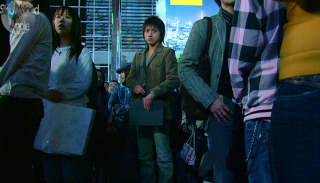 While all of this is happening, a law student named "Light" (Tatsuya Fujiwara, who has thankfully removed the frightwig which adorned him so very fetchingly in the two Battle Royale films ;-)), who seems to be disenchanted with the entire justice system, watches on. It's later revealed that Light is the owner of the Death Note, a notebook which allows the owner to kill whoever they want just by writing their name in it. Along with the book, Light receives a Death God, a Shinigami, to watch over him, or something, hey, it's just an excuse to have a giant CGI thing there. I don't really know what the Shinigami is doing with Light, all I know is that it just looks like a giant plastic action figure and eats only apples(?!). Presumably giant plastic ones. Of course the book should only be used on criminals, the dregs of society, and Light wields the book as such. For now, anyway.