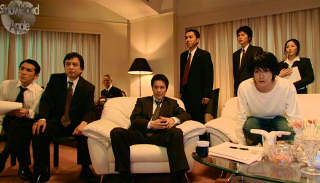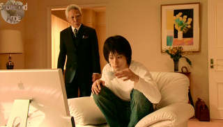 Meanwhile, the police are at their wits' end as to the explanation of these deaths, seeing them as not just mere coincidences but as actual deliberate assassinations, although there is no evidence of such. Amidst the chaos, a mysterious man offers the assistance of an internet figure named "L" (eventually emerging as Ken'ichi Matsuyama, who is now seemingly the new owner of Fujiwara's old frightwig) who only speaks to them through a laptop. Could be George Bush, could be Steve Jobs, could be Taro Suwa for all we know at this point.