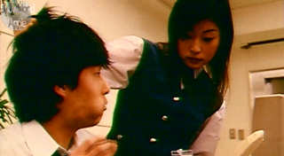 Certainly his amorous co-worker sees this devotional offering as the handiwork of a girlfriend, at the very least. He denies it, and tells her the lunches are made by his mom. This little scene shows Yoshio in an interesting light: he's absolutely passive and submissive to the females dominating his life - he couldn't say no to Aiko, who virtually dragged him off the street for sex; he couldn't say no to his mom, who wanted him back early from work; and he can't even say no when his pushy co-worker tries to seduce him.