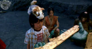 Suddenly, we are plunged into the world of the yokai. Accompanied by three of them – the red Kirin spirit, Kawataro, a kappa water yokai, and Kawahime, a river princess – Tadashi moves to the cave of the goblin via a number of tests (such as a rotten rope bridge, and a giant rolling boulder) which echo the early sequences of Indiana Jones more than anything, with the rather tiresome comic antics of Kawataro very reminiscent of early-80s TV series Monkey. Just as the goblin is about to hand over The Legendary Sword, Agi and her monsterbot mates pop through the roof and attack, slicing the sword in two and kidnapping (hamsternapping?) Sunekosuri before being recalled by Kato.