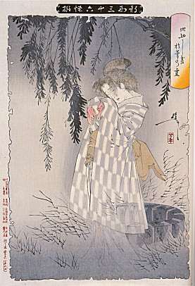 The story of Ring would seem at first to be rooted firmly in the 20th century, with its central urban-legend theme of a cursed videotape which kills anyone who see it within 7 days; however, the mysterious main character, Yamamura Sadako, is definitely based on a very traditional Japanese character: the vengeful female ghost. Long in Japanese art and theatre (certainly since the Meiji period), as well as the hannya (female demons) of ancient folktales, evil female spirits have been popular figures. In kabuki and noh, there are stories such as Oiwa (the tale of a woman poisoned by her husband who returns to kill him) and Okiku (about a female servant killed and thrown down a well which she then haunts every night). However, the real secret of the video-curse, a virus part-smallpox and part-Sadako's DNA, is again defiantly 20th century, ensuring that the story is relevant to contemporary issues as well as ancient mythology.