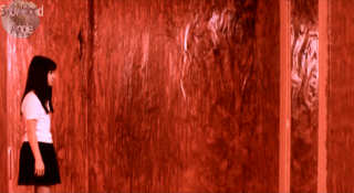 as Mitsuko walks down long red squelchy-sounding corridors. But